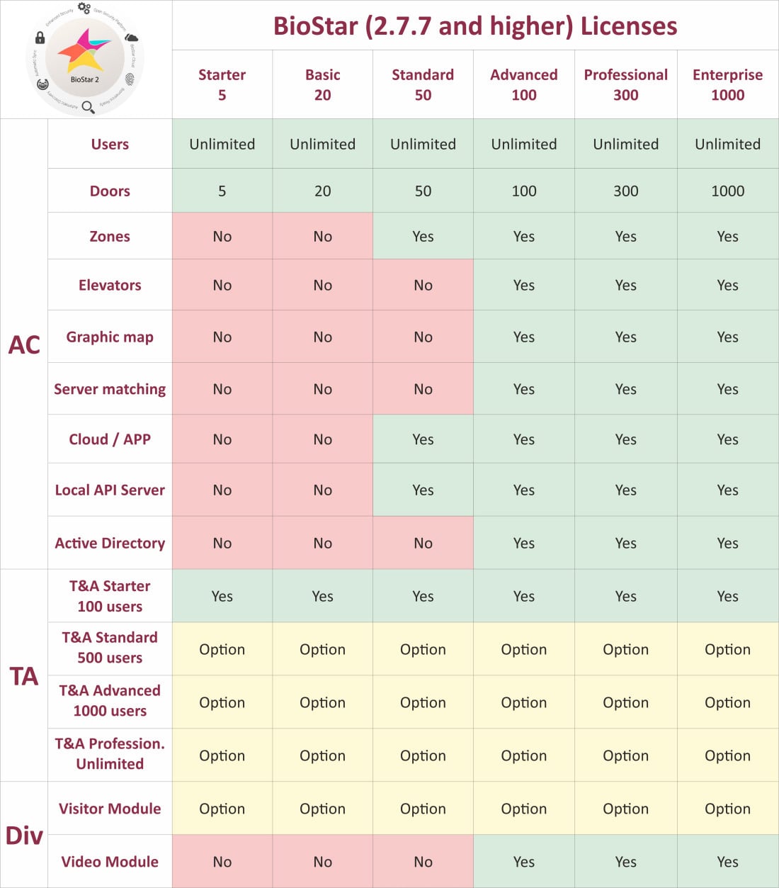Terminal biométrica, Detección de rostros, comunicación TCP/IP, RS-485, USB, Slot SD y WiFi, Display LCD color de 5" táctil, Lector incorporado (ver modelos), Sensor de última generación, 500.000 usuarios (1:1), 100.000 usuarios (1:N), 1.000.000 de eventos, Velocidad de autenticación de 150.000 huellas por segundo, Salida de relé, Entrada para REX y sensor de puerta, Ent/Sal Wiegand, 12Vcc/PoE, Software BioStar 1 y 2.